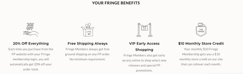 The Fringe is a type of loyalty program, rewarding their best customers for their continued support. The Fringe gives members benefits like free shipping, 20% off storewide, and VIP access to sales or new products before anyone else. Although the membership is $10 a month, you get this amount back with a monthly store credit of $10 to spend storewide.